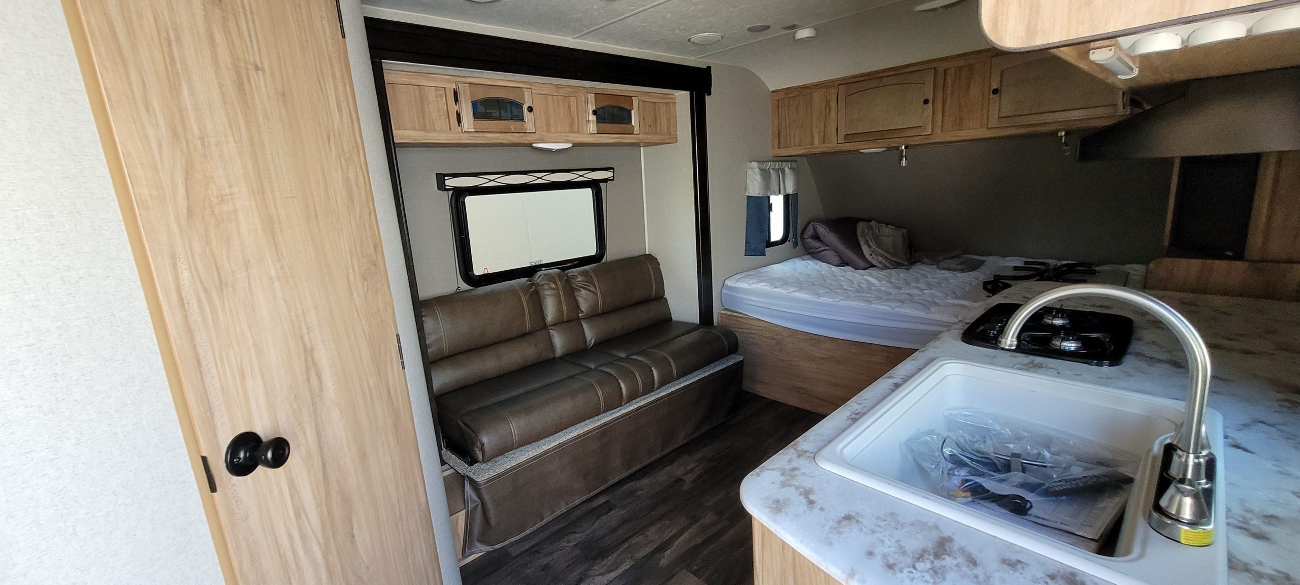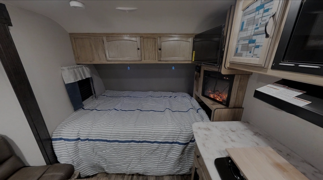 Our Most Compact Trailer! Features a Small Slide with Jackknife Sofa, Full Queen Bed, Fireplace, TV, and Great Kitchen Layout!
